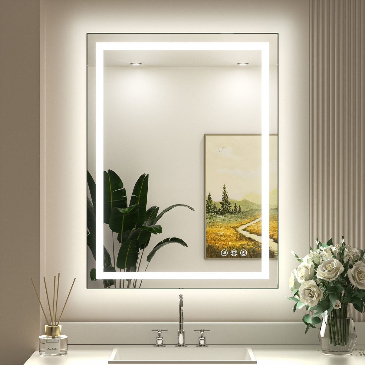 Stepless Dimmable & 3 Color: this led bathroom mirror can stepless brightness adjustment from 5% to 100% and color temperature from warm to white, with smart memory function remembers your last used light state setting