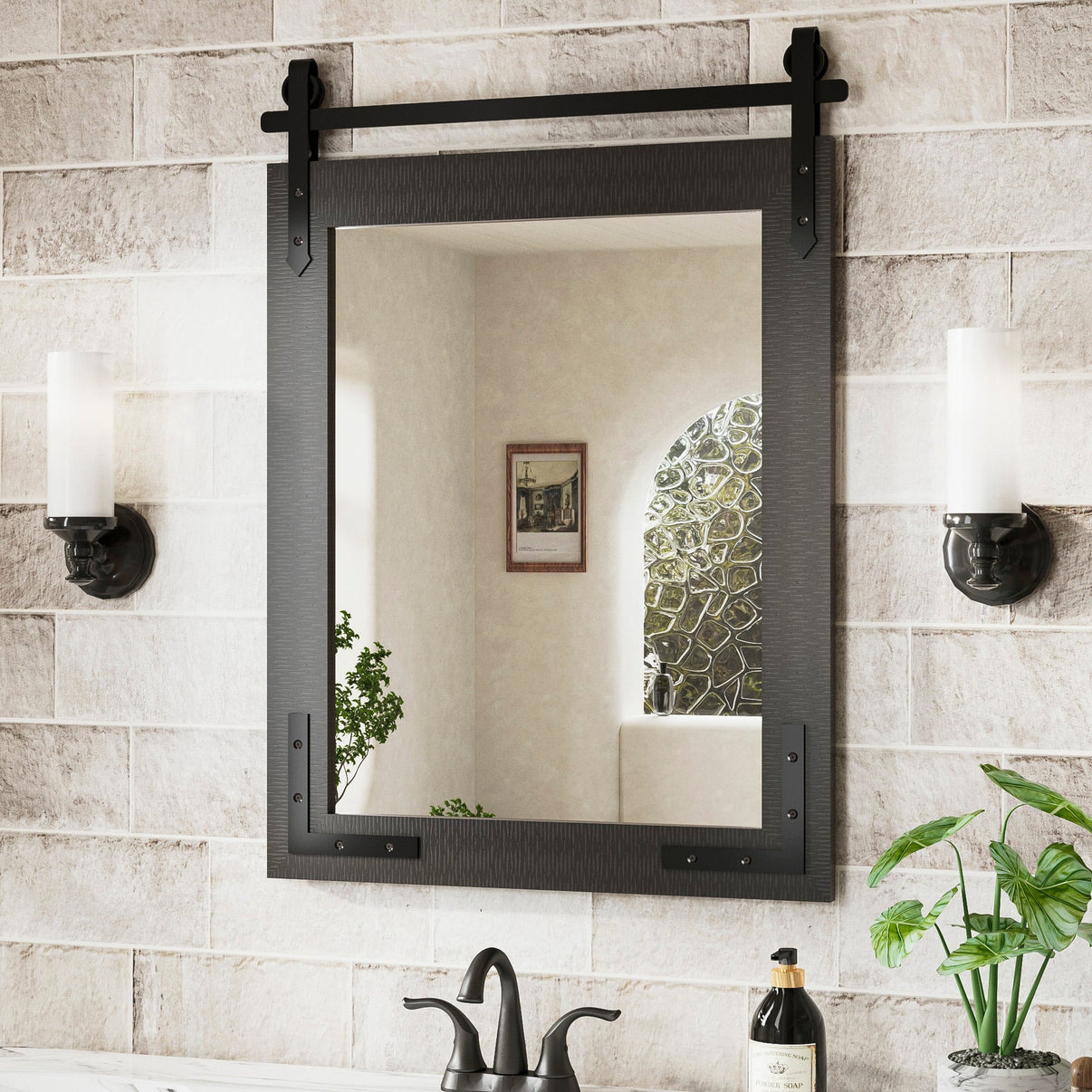 • Natural Wooden Farmhouse Barn Door Mirror Rustic Wood Framed Bathroom Vanity Mirror for Wall
